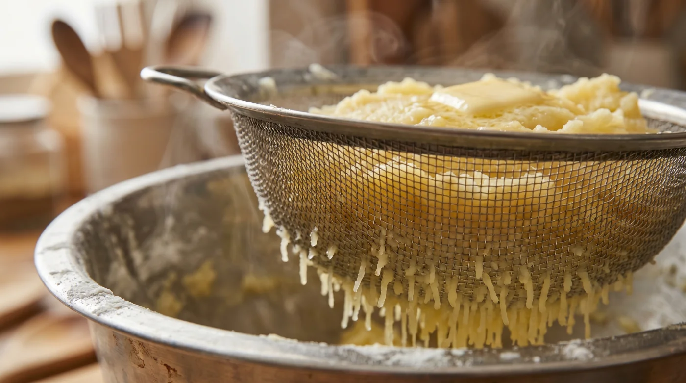 • Pressa direkt och utan dröjsmål: Arbeta omedelbart medan potatisen är rykande het. Lägg en slev potatis i silen och pressa igenom med baksidan av en robust slev eller en stadig degskrapa.