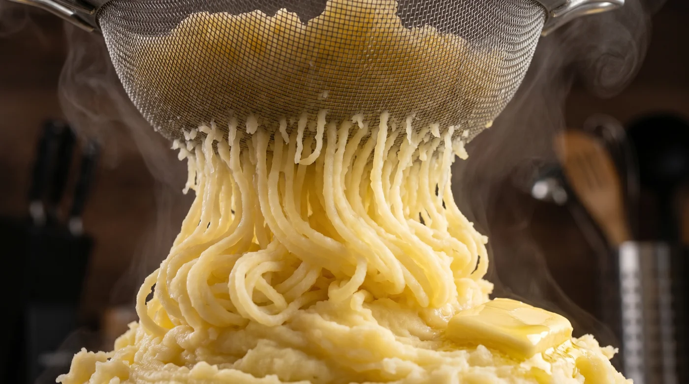 Genom att istället tvinga den nykokta potatisen genom ett nät av stål förändrar du hela processen. Du slår inte sönder strukturen; du filtrerar fram kärnan. Silen agerar som en tullspärr som vägrar släppa igenom minsta tillstymmelse till ojämnhet. Det som landar i skålen nedanför är ett viktlöst snöfall av ren potatis, redo att absorbera fett utan att förlora sin luftighet.