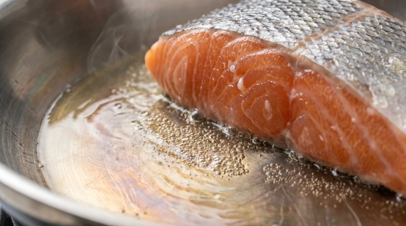 När vi värmer olja från kallt i en kall panna, bryts oljans struktur ner i takt med att metallens mikroskopiska sprickor vidgas. Tänk dig pannan som en hud. Värmer du upp den långsamt med oljan hinner porerna suga åt sig fettet och proteinet från laxen klibbar därefter obevekligt fast i metallen utan skydd.