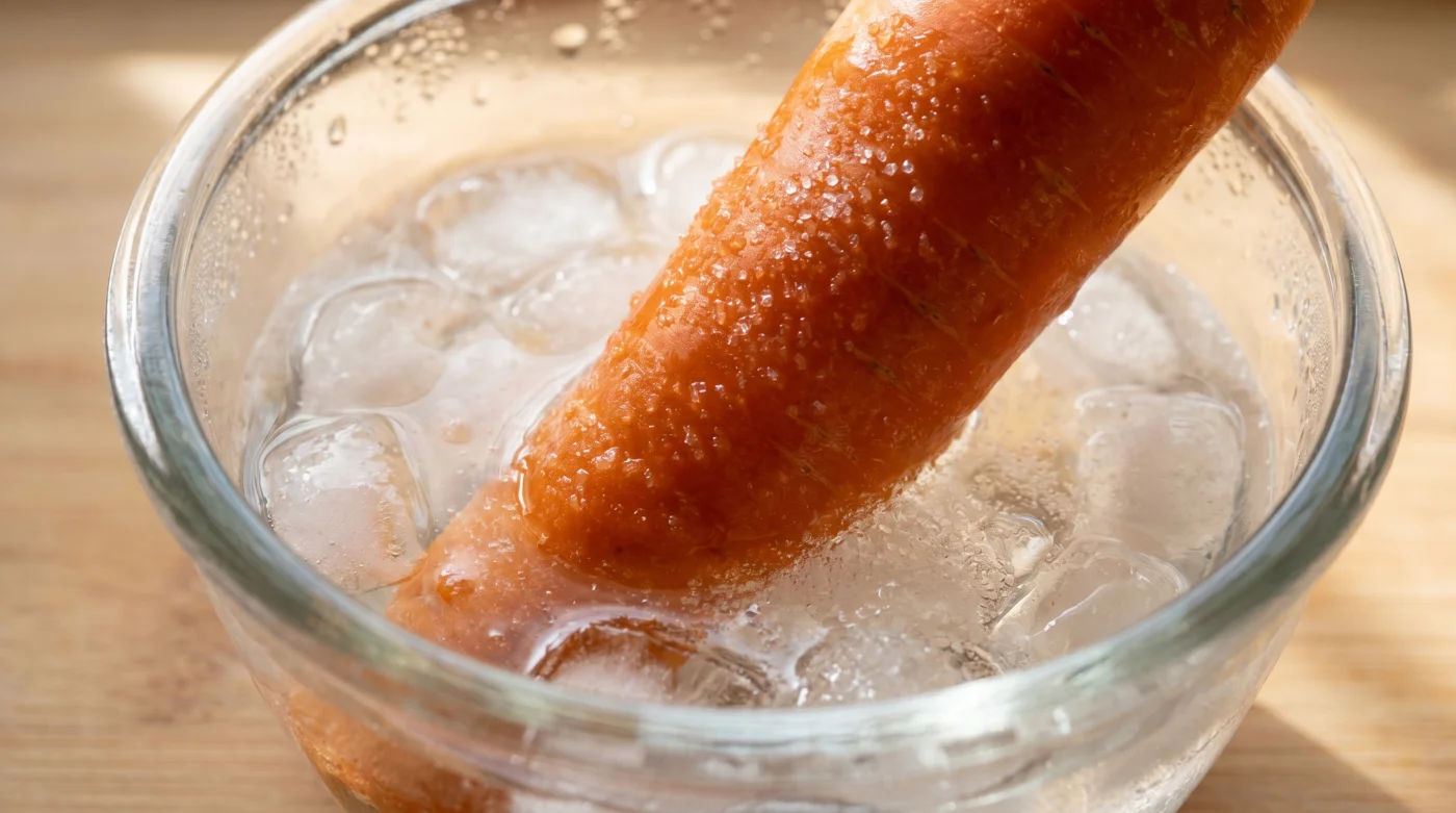 Här kommer kombinationen av strösocker och rikligt med is in i bilden som en oväntad räddare. Genom att blanda till ett isbad med en mycket noga avvägd mängd socker aktiverar du en försiktig, kontrollerad osmos i rotfrukten. Sockret i vattnet speglar morotens helt naturliga sötma och förhindrar effektivt att de svältande cellerna drar in för mycket smaklöst vatten för snabbt. Istället byggs trycket stadigt upp inifrån, och den naturliga spänsten återvänder utan att smaken späds ut det minsta.