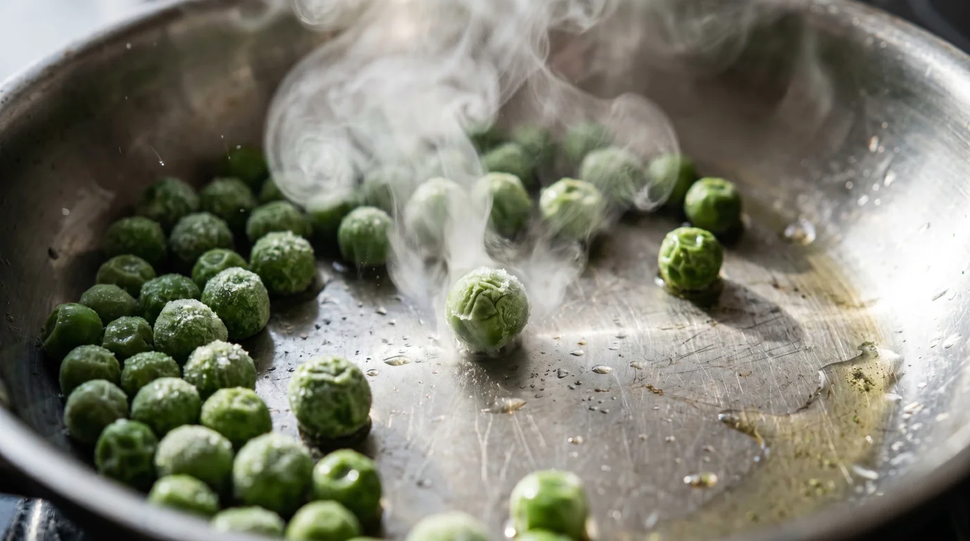 När du däremot utsätter den frysta grönsaken för omedelbar, extrem värme händer något magiskt. Den tunna hinnan av yt-is förångas på ett ögonblick.