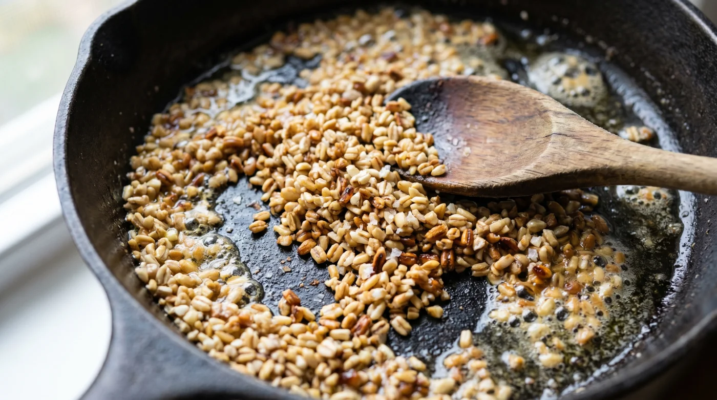 Hemligheten ligger i att låta smöret tystna i pannan innan grynen åker i. När vattnet i smöret har kokat bort slutar det fräsa, och det är din signal att agera.