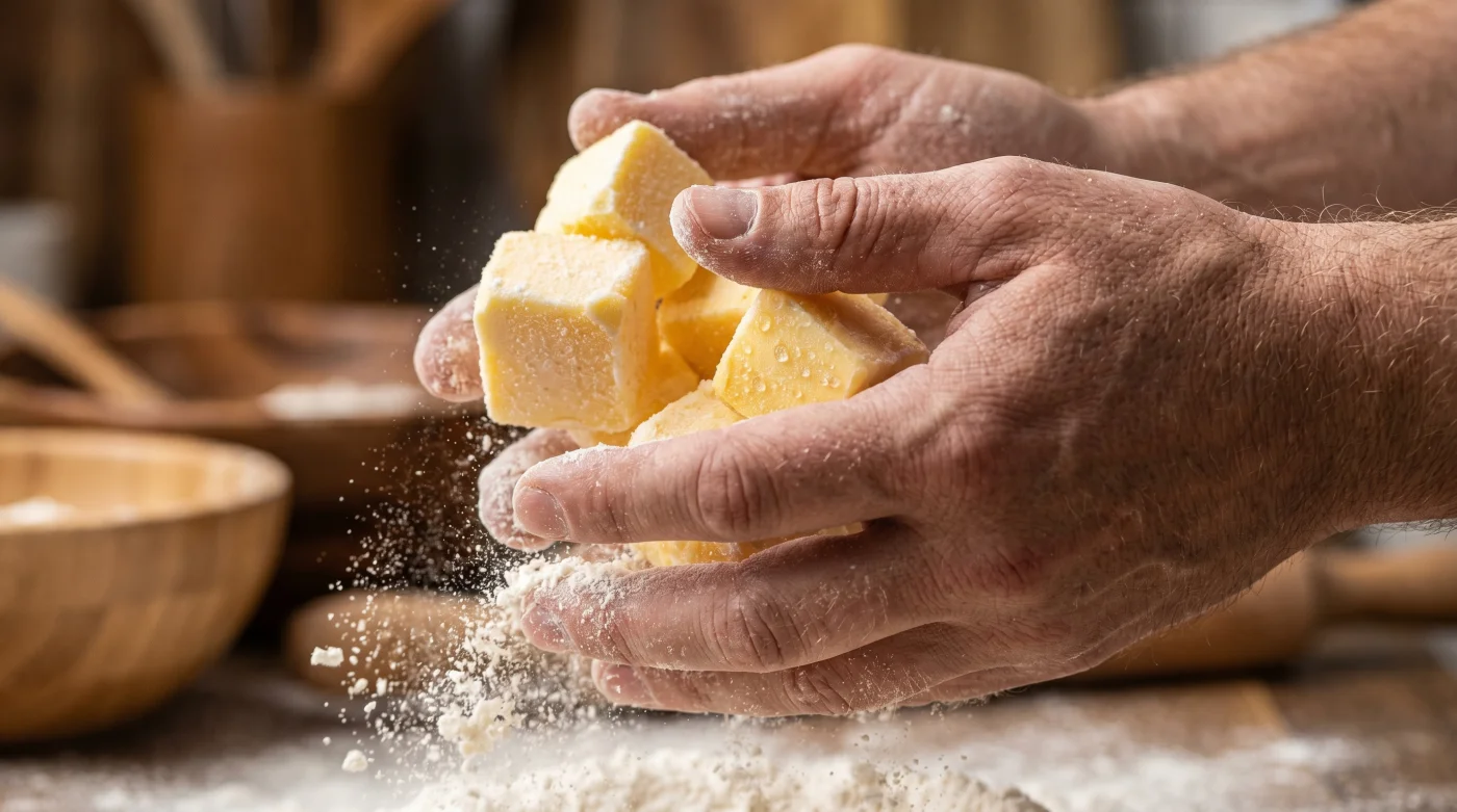 Tänk på din pajdeg mer som ett antikt murverk av natursten, snarare än en slät och homogen betongvägg. Om du gnuggar in ett rumstempererat smör i vetemjölet tills det ser ut som en fuktig sand, har du tyvärr redan skapat ett problem. Mjölet suger omedelbart åt sig fukten från det mjuka fettet, vilket snabbt aktiverar mjölets proteiner och bildar gluten.