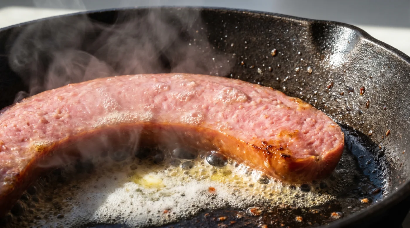 Under en regnig midsommar förklarade han fenomenet för sin skeptiska familj medan han stod vid spisen. Ni steker den som biff, muttrade han över axeln. Men en korv är en skör blandning som måste vakna mjukt. Genom att hälla en skvätt vatten i pannan tillsammans med smöret skapade han ett tillfälligt mikroklimat av mild ånga. Vattnet höll nere temperaturen precis tillräckligt länge för att proteinerna i skivorna skulle hinna slappna av och expandera, istället för att dra ihop sig i panik.