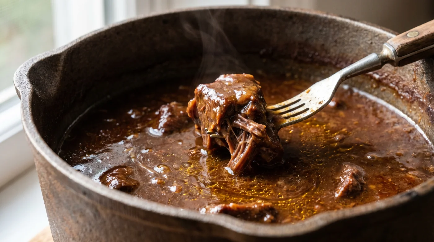 Traditionen dikterar nästa steg med en nästan sömngångaraktig precision. Du brukar öppna en flaska rött vin, hälla den över det brynta köttet och sedan ställa in dig på väntan på det perfekta sönderfallet. Tre, ibland fyra timmar av vaktande innan högreven slutligen ger med sig och trådarna börjar lossna från varandra.