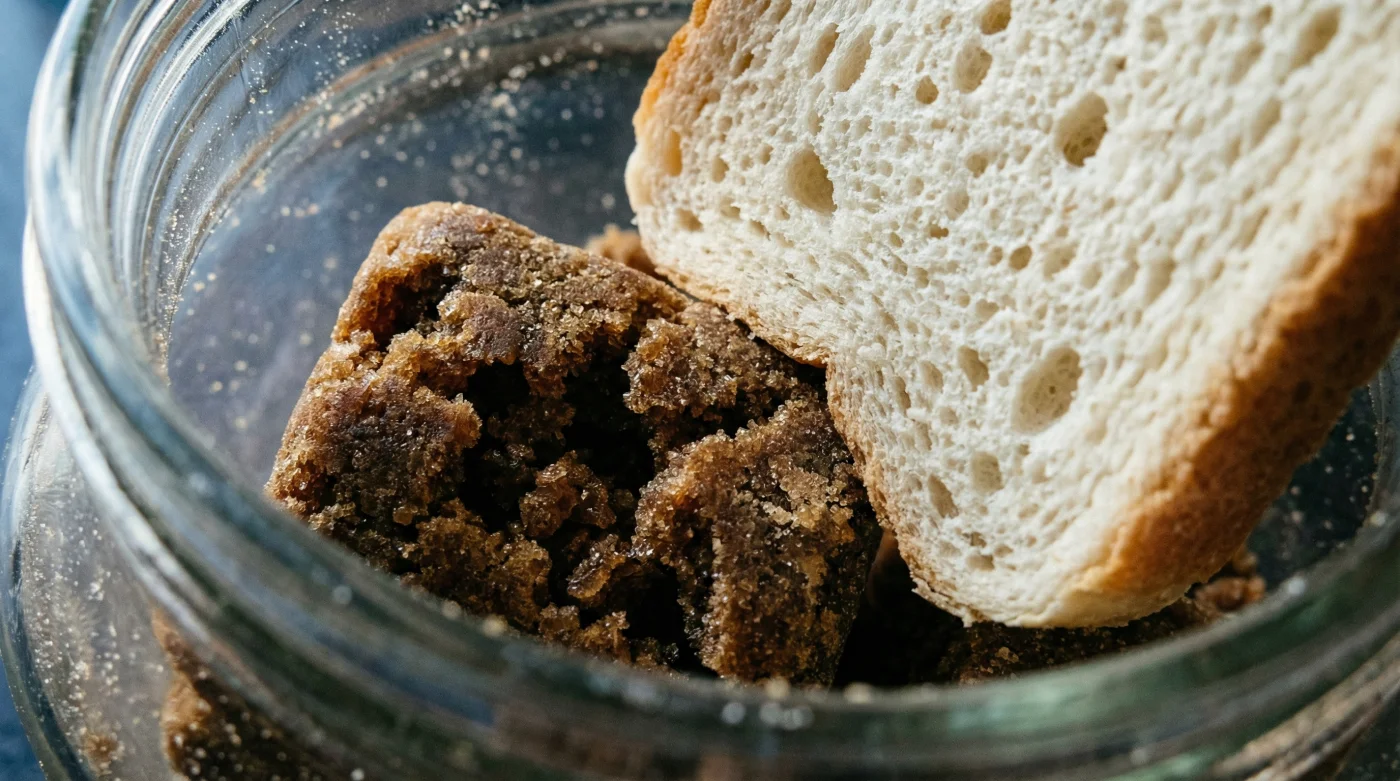 När du öppnar burken morgonen därpå kommer du att mötas av en fascinerande syn. Den en gång så mjuka brödskivan har förvandlats till en kruttorr, stenhård skorpa. Den har bokstavligen gett sitt liv för ditt bakverk. Men under den väntar belöningen: farinsockret är lika mjukt, mörkt och följsamt som den dagen du lyfte det från butikshyllan. Du kan enkelt trycka ner en sked och se hur det formar sig perfekt utan minsta motstånd.
