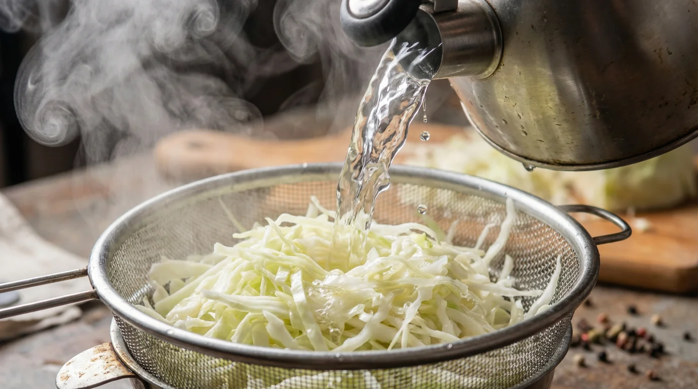 Men om vi utsätter kålen för ett snabbt möte med kokande vatten, händer något fundamentalt. Värmen får cellväggarna att kollapsa ögonblickligen. Ett tre sekunder kort och hett vattenfall över durkslaget bryter ner fibrernas naturliga envishet och förvandlar de stela strimlorna till öppna, törstiga svampar.