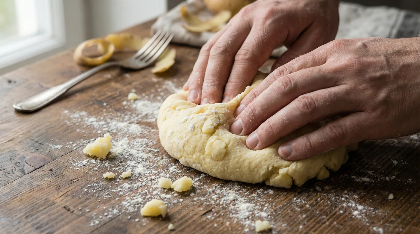 För detaljisten handlar förberedelsen om att använda verktygen rätt och riva den kalla potatisen på det allra finaste rivjärnet. Du vill absolut inte mosa den med en gaffel, eftersom kylan har gjort den kompakt och du då riskerar att få hårda små klumpar i degen. Genom att riva den till ett snöliknande pulver skapar du maximal yta för ägget och mjölet att fästa vid, vilket ger dig en luftig deg som i princip bara behöver kramas ihop, inte knådas.