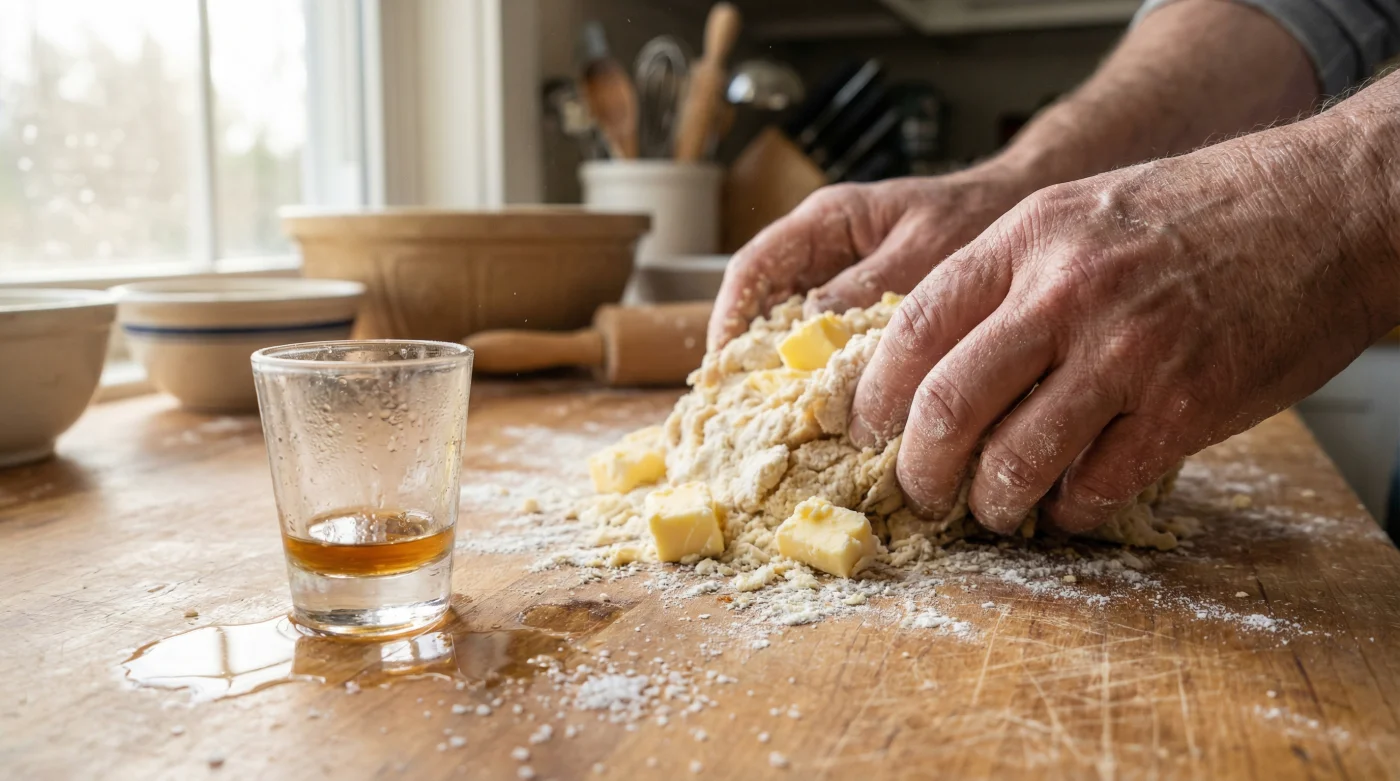 Detta bageriknep bygger på ren och skär kemi, men känns nästan som magi i händerna. Vodka består till 40 procent av etanol. När du tillsätter en eller ett par matskedar iskall vodka i din pajdeg, får du all den fukt du behöver för att binda ihop smulorna till en smidig, följsam boll. Kaveln glider bokstavligen över degen utan att den spricker. Men – och här är den stora belöningen – etanol utvecklar inte gluten överhuvudtaget.