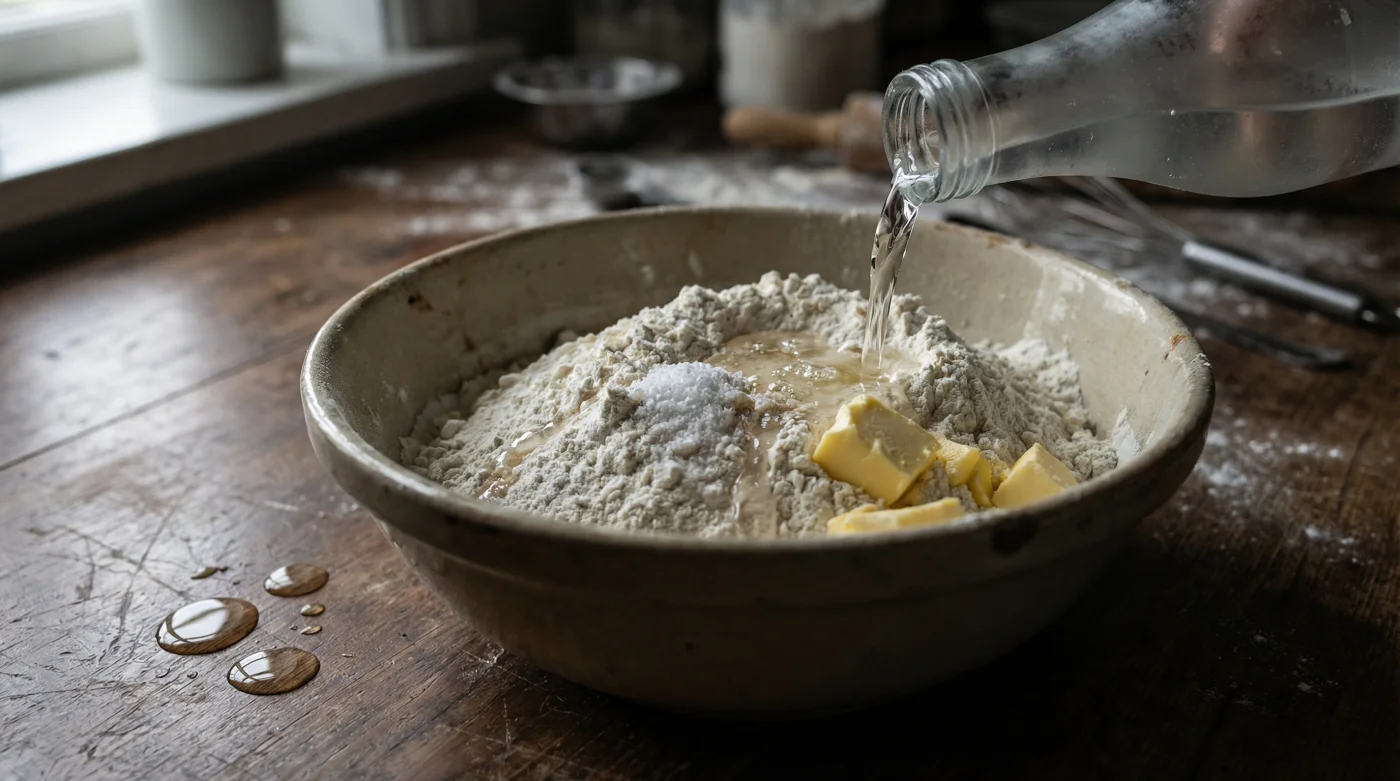 Vodka består till hälften av vatten och hälften av etanol. Etanolet vägrar konsekvent att binda sig med mjölets proteiner. Genom att byta ut hälften av det traditionella receptets isvatten mot iskall vodka, får du en deg som är tillräckligt fuktig för att gå ihop till en boll, men utan att trigga den massiva glutenutvecklingen. Det är ren, fysisk logik.