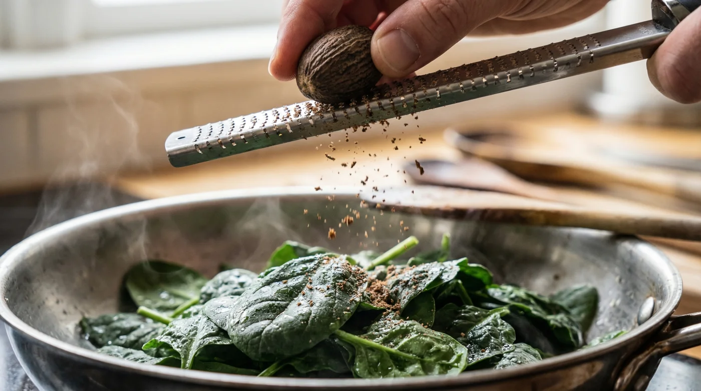 Hemligheten stavas muskotnöt. Inte en hel matsked, och absolut inte den dammiga sorten från en gammal plastburk. Bara ett mycket varsamt drag över rivjärnet med en hel nöt. Det kemiska mötet som sker i kastrullen är omedelbart och påtagligt. När den frysta spenatens oxiderade järnföreningar möter muskotens varma oljor uppstår en fysisk reaktion i våra smaklökar.