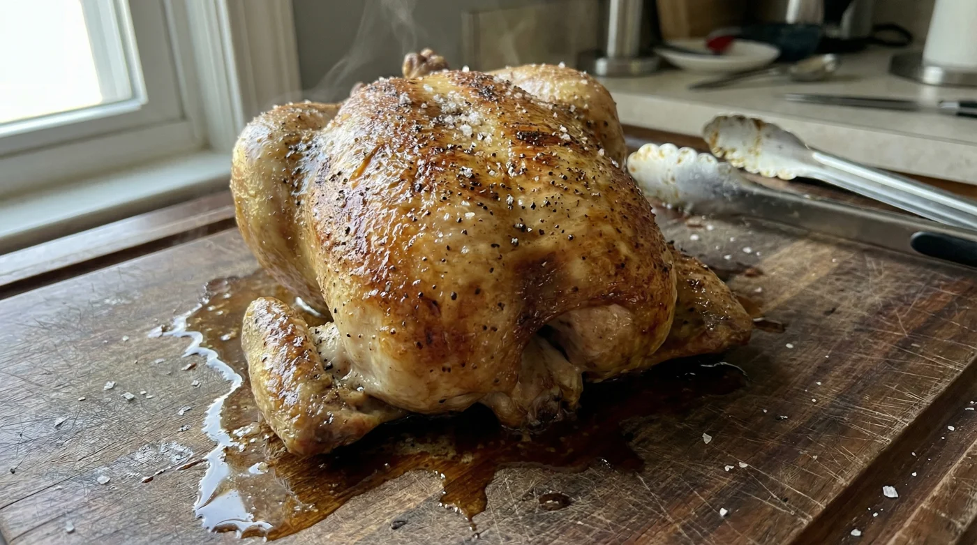 Låt kycklingen vila ostört i minst tjugo minuter. Du behöver inte täcka den med folie – det gör bara det krispiga skinnet ångkokt och mjukt. Låt den andas fritt i rumstemperatur medan tyngdkraften gör sitt tysta arbete.