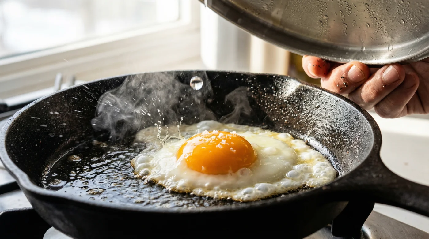 Mät upp en knapp matsked kranvatten. Häll det snabbt ner i pannan, men inte direkt på ägget, utan på den fria metallytan bredvid. Det kommer omedelbart att börja koka och förångas. Sätt genast ett tättslutande lock över hela härligheten.