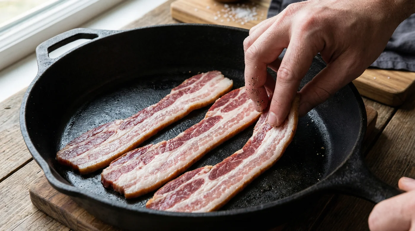 För entusiasten med tjocka skivor handlar det om att gå ett steg längre. Rejäla bitar, ofta rökta över äppelträ eller hickory, kräver ännu mer varsamhet för att inte bli torra och trådiga i mitten. Tillsätt två matskedar kallt vatten i den kalla pannan tillsammans med köttet. Vattnet hjälper till att koka bort råheten medan fettet smälter i lugn och ro, och när vattnet väl har förångats tar den rena stekningen mjukt vid.