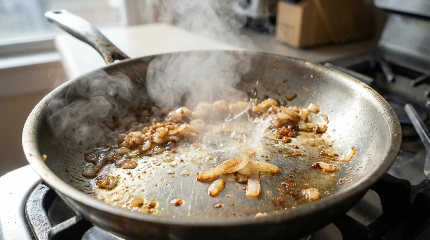 Det fräste till våldsamt. Ett tjockt moln av ånga steg upp mot fläkten. Jag trodde att han hade förstört hela satsen. Men han log bara. Istället för att avstanna brynprocessen löste det kalla vattnet omedelbart upp de mörka, smakrika sockerarterna som fastnat i botten – fonden – och limmade tillbaka dem på löken. Resultatet var en mjuk, intensivt karamelliserad lök på halva den förväntade tiden.