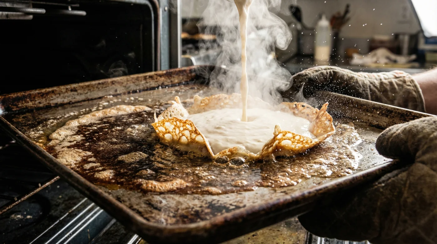 Dra ut plåten till hälften, snabbt men försiktigt. Häll den vilade smeten rakt ner i det fräsande, brynta fettet. Du kommer omedelbart att höra ett intensivt sprakande, en fysisk reaktion när den kalla vätskan träffar det skållheta smöret. Smetens kanter kommer att krulla sig och omedelbart börja klättra uppför plåtens sidor. Skjut snabbt in pannan igen och stäng luckan. Här räknas varje sekund, för du vill stänga in den värme som ska pressa upp pannkakans mitt.