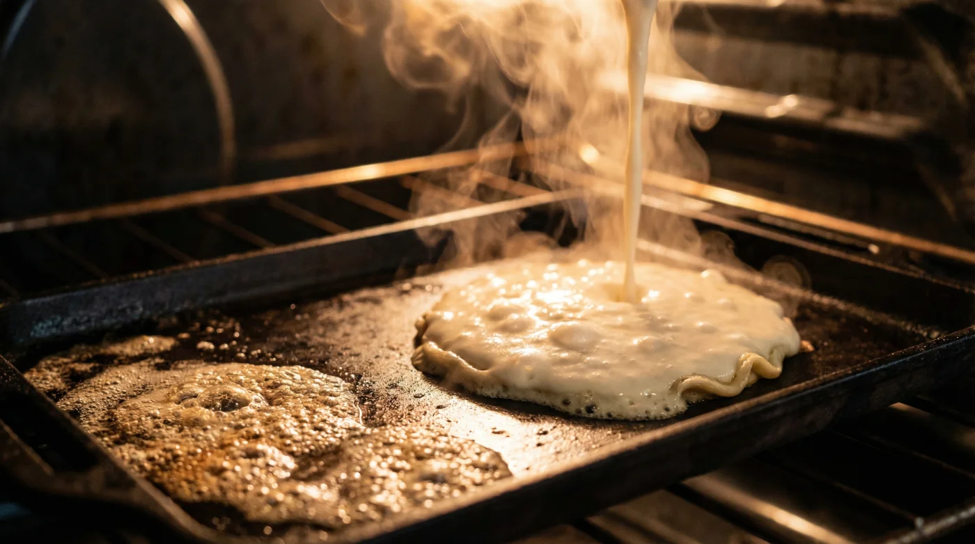 Dra ut plåten till hälften, snabbt men försiktigt. Häll den vilade smeten rakt ner i det fräsande, brynta fettet. Du kommer omedelbart att höra ett intensivt sprakande, en fysisk reaktion när den kalla vätskan träffar det skållheta smöret. Smetens kanter kommer att krulla sig och omedelbart börja klättra uppför plåtens sidor. Skjut snabbt in pannan igen och stäng luckan. Här räknas varje sekund, för du vill stänga in den värme som ska pressa upp pannkakans mitt.