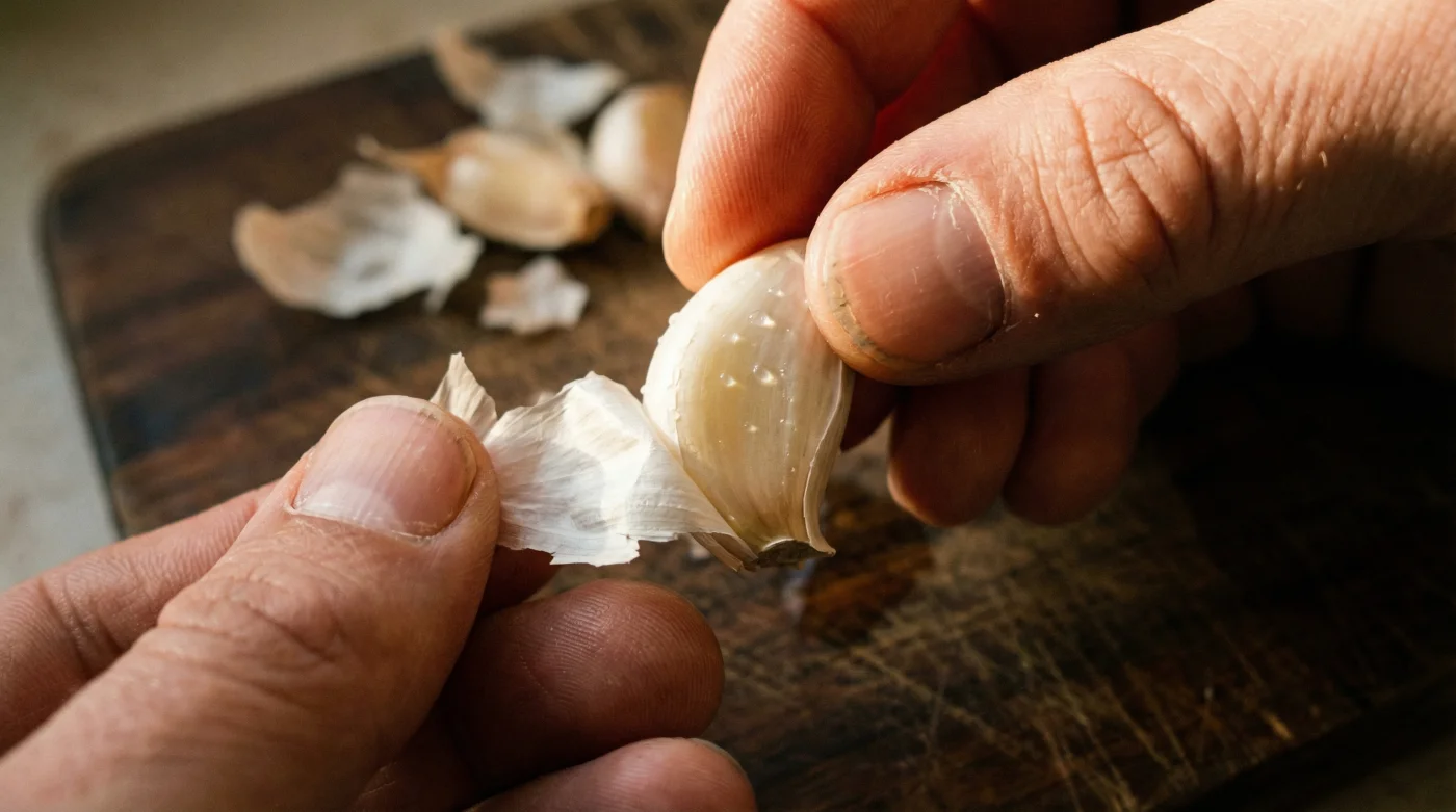 Du står vid köksbänken. Skärbrädan bär fortfarande minnet av gårdagens middagsförberedelser. Dina fingrar är klibbiga, doften av allicin har redan satt sig djupt i huden. Du försöker skala en färsk vitlöksklyfta. Det papperstunna skalet klamrar sig fast vid köttet som om det vore fastlimmat. Naglarna skrapar, en liten flisa av skalet bryts av och kilar in sig under din tumnagel. Frustrationen växer. Denna lilla, oansenliga ingrediens borde inte kräva så mycket av din kväll.