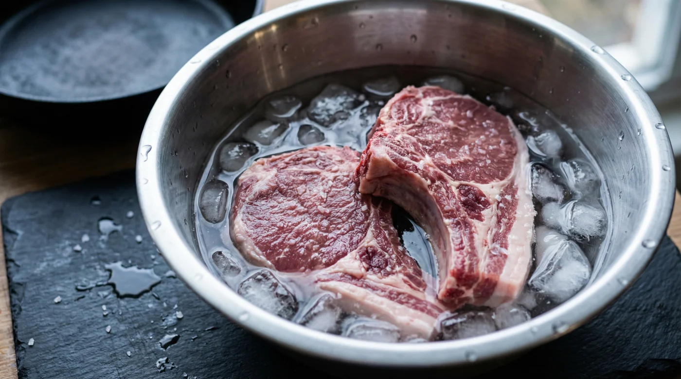 Men om du sänker ner köttet i ett iskallt saltvattenbad – en klassisk rimlag – händer något nästan magiskt. Det salta vattnet tvingar fibrerna att slappna av och öppna sig, som en torr svamp som möter morgondaggen. Femton korta minuter i detta bad spränger omedelbart in fukt i köttet.