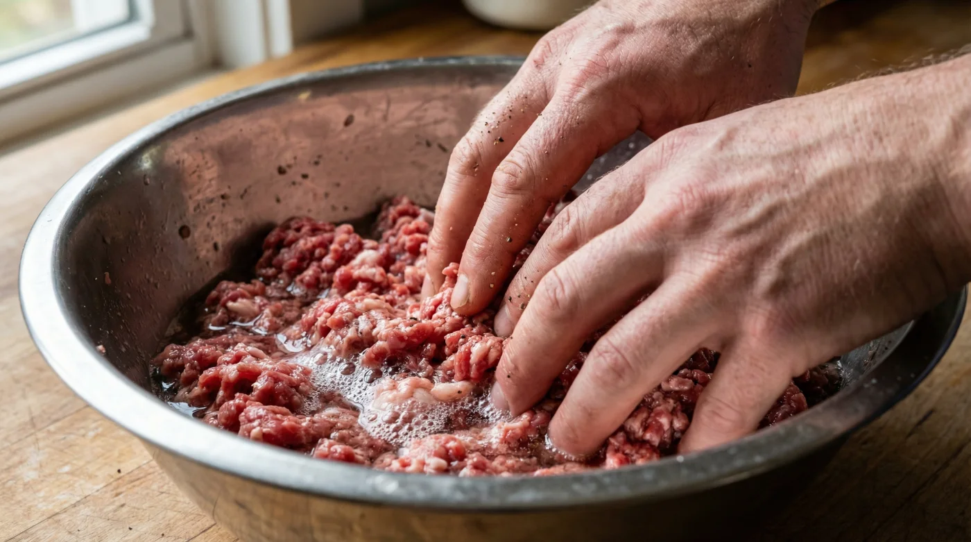 | Iskall kolsyra blandas i färsen | Kylan hindrar fettet från att smälta i förtid, bubblorna bäddas in intakta. | En stabil råvara som är lätt att forma med blöta händer. |