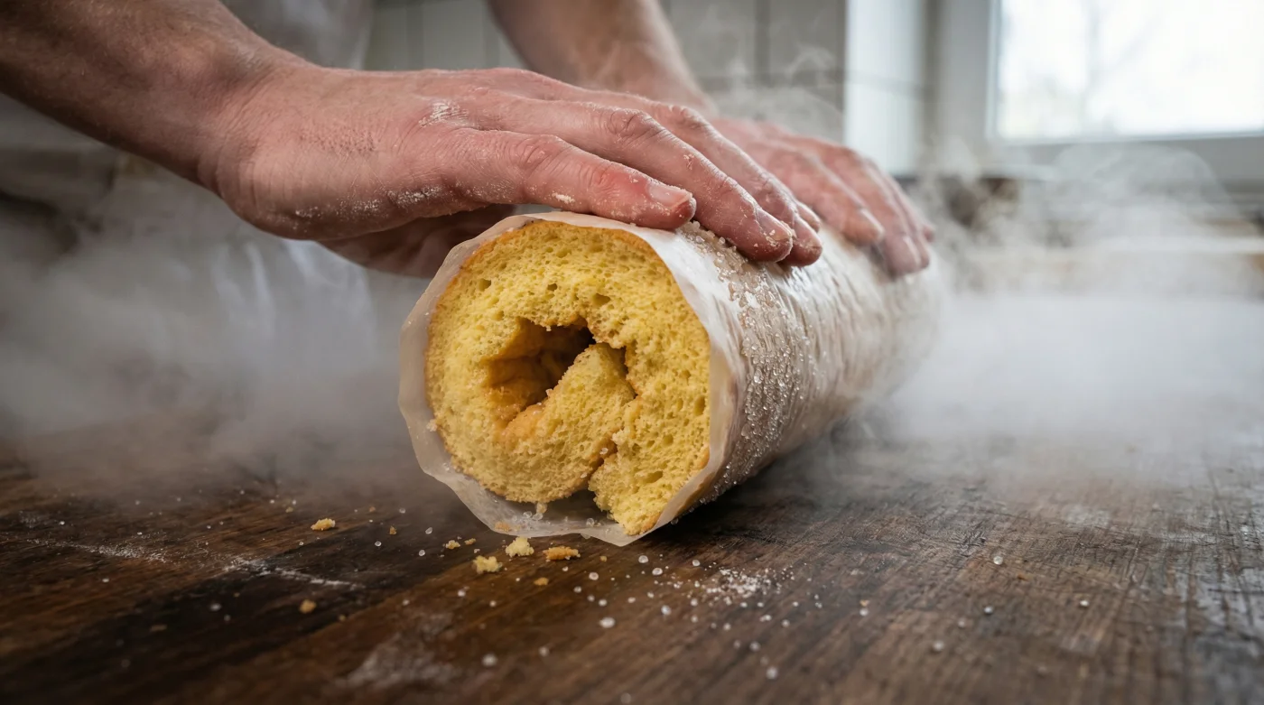 Tänk på sockerkakssmeten som upphettad glasmassa. Så länge den är varm och rörlig kan du forma den till nästan exakt vad som helst utan att den protesterar. Men i samma lilla sekund som temperaturen sjunker, binds äggproteinerna och stärkelsen i vetemjölet samman till ett stumt, oförlåtande nätverk. Om du någonsin försökt böja ett kallt fönsterglas, vet du exakt vad som händer. Det är precis samma ofrånkomliga logik som styr cellerna i din rulltårta.