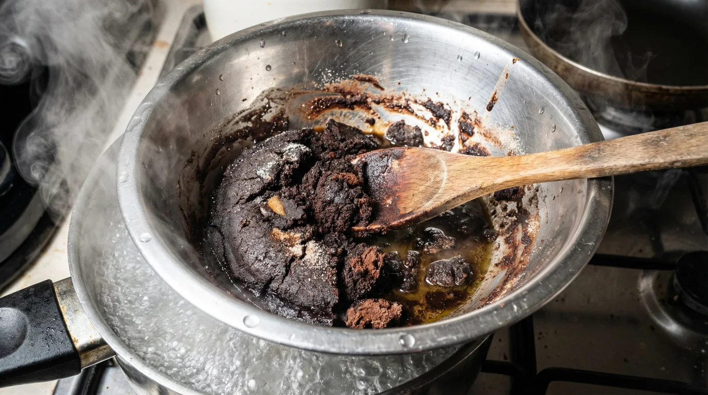 Vattnet under skålen dånar. Stora bubblor slår aggressivt mot bottnen av glaset. Men istället för att smälta mjukt och följsamt, händer något oväntat. Chokladen blir plötsligt grynig, tjocknar obönhörligt och antar en oaptitlig, gråaktig och torr ton.