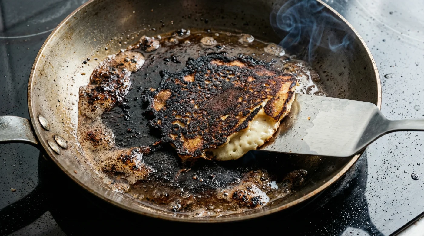Men något händer nästan omedelbart. Kanten blir obehagligt mörkbrun, nästan svart, långt innan mitten av pannkakan ens har börjat sätta sig. Du försöker desperat föra in en stekspade under den lövtunna kakan för att vända den, men den sitter envist fast i metallen. Det är som om hela ytan i din stekpanna plötsligt har förvandlats till ett snabbtorkande superlim, och doften av intensivt bränt smör fyller långsamt hela köket med en beskt stickande rök.