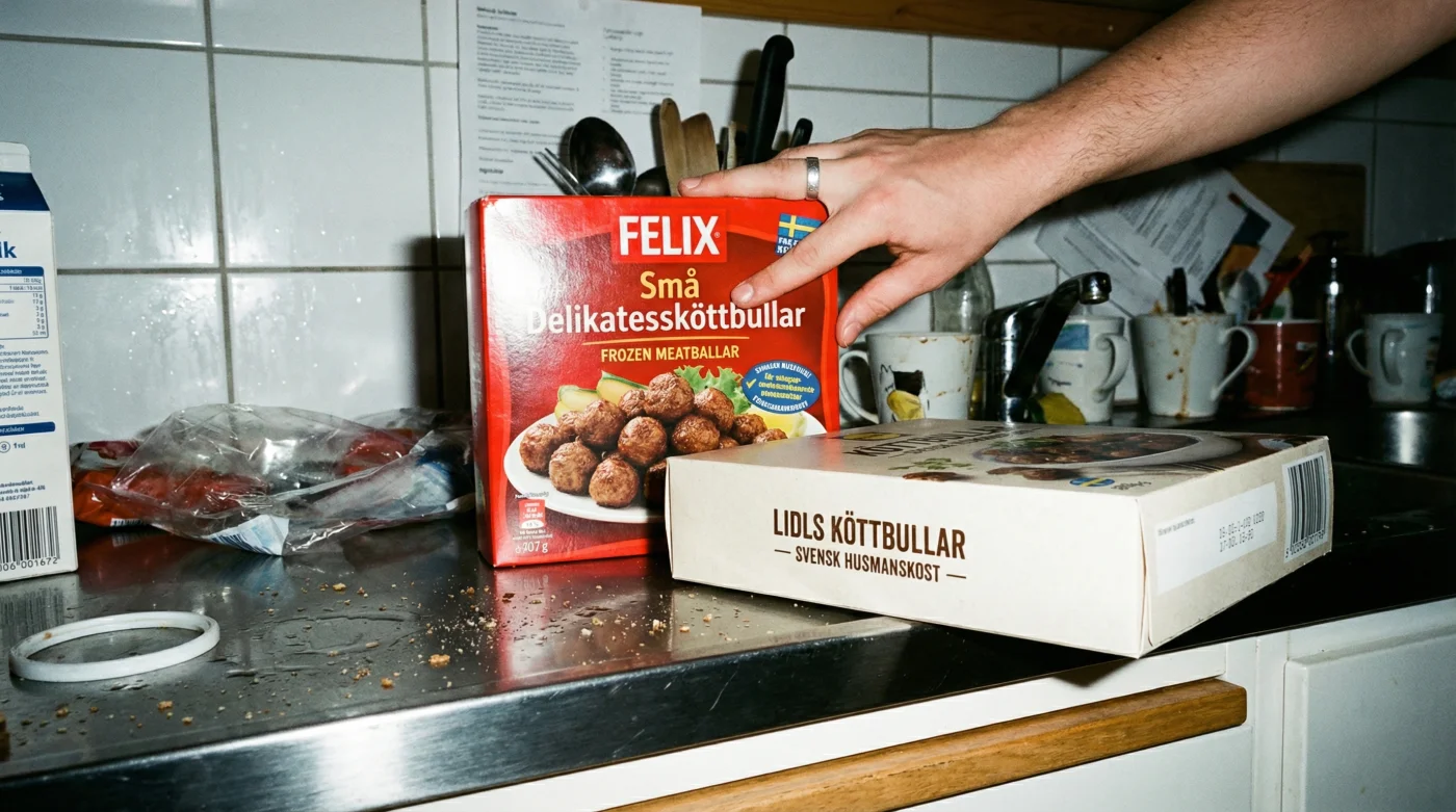 Det är en regnig tisdagseftermiddag och lysrören surrar svagt över de välbekanta kyldiskarna. Du rullar kundvagnen med ett hjul som drar lite åt vänster, och slänger ner de vanliga, trygga förpackningarna: falukorven med den klassiska logotypen, köttbullarna barnen vägrar byta ut och pannkakssmeten som sparar dig tio minuter. Det är en invand rytm, men när kvittot matas ut ur kassan lägger sig en välbekant tyngd över bröstkorgen.