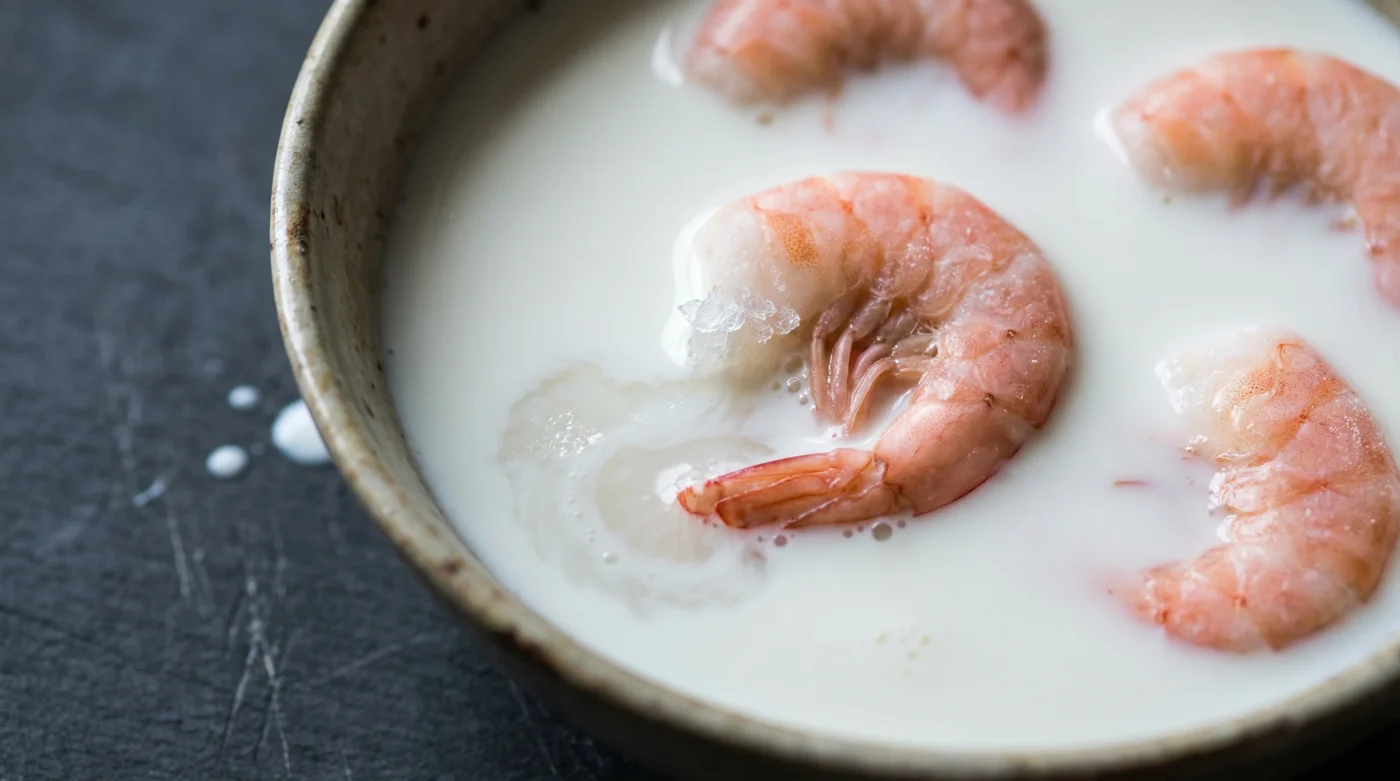Kemin bakom detta trick är lika fascinerande som den är grundläggande. Mjölksyran i mejeriprodukten fungerar som en naturlig och ytterst skonsam mörningsprocess. Den slappnar av skaldjurets muskler istället för att chocka dem. Samtidigt går mjölkfettet in och agerar som en magnet för trimetylamin. Det är exakt det ämne som ger skaldjur och fisk den där skarpa, ibland aningen fräna doften när de legat lite för länge i en frysdisk. Fettet suger åt sig doftmolekylerna och lämnar kvar en ren råvara.