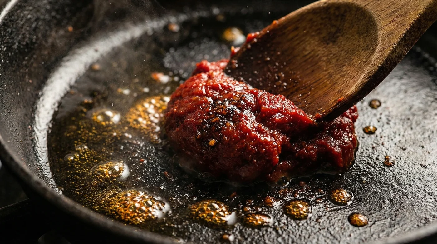 När din lök och vitlök har fräst klart, skapar du snabbt en bar fläck i stekpannan. Klicka i purén där, tillsätt eventuellt lite mer fett, och låt den fräsa intensivt under ständig omrörning i bara sextio sekunder. Den korta stunden är tillräcklig för att bränna bort den råa bismaken och väcka umamin, utan att försena middagen nämnvärt. Blanda sedan samman allt och fortsätt med receptet.
