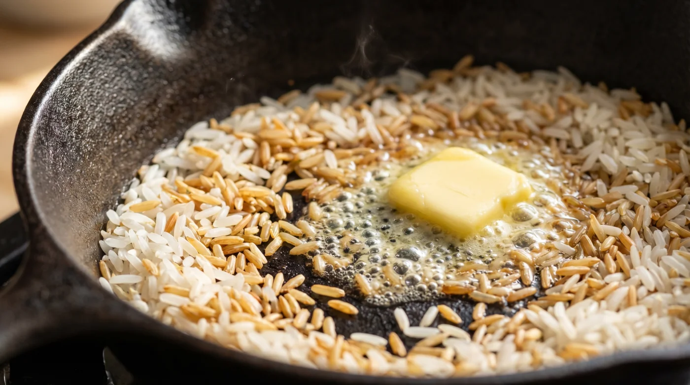 | Smörrostning | Varmt fett förseglar kornets porösa yta på lugn medelvärme i tre minuter. | Garanterat luftiga, perfekt separerade korn med en mjuk, nötig grundsmak. |