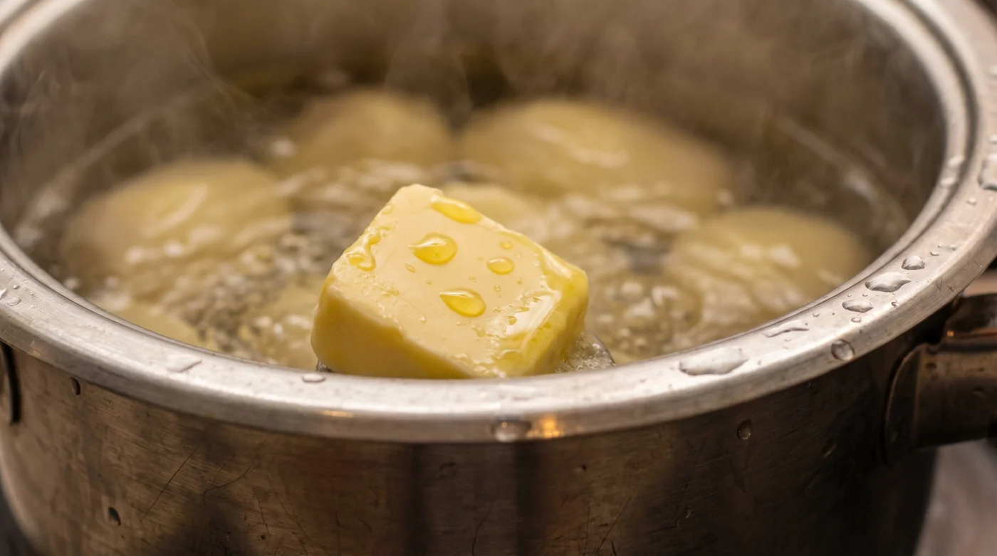 När du lagt potatisen i vattnet, låt värmen arbeta tills de första vita bubblorna bildas i kanterna. Släpp sedan ner smöret precis i mitten av kastrullen. Du kommer att se hur en spegelblank zon omedelbart sprider sig utåt mot metallens kanter. Skummet drar sig tillbaka, som om vattnet andades ut mot en kall fönsterruta.