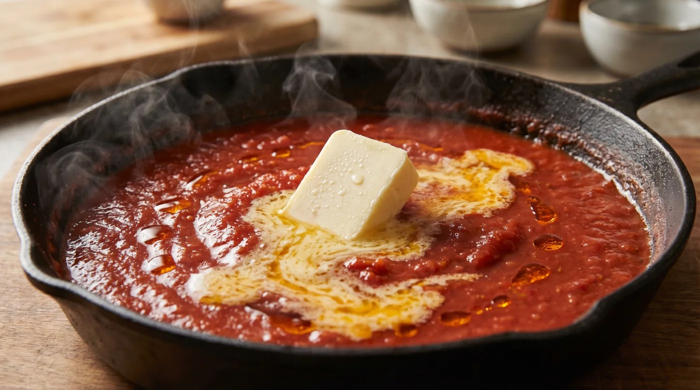 När du pudrar ner riven ost eller häller i en skvätt grädde under kokningen förändrar du oundvikligen hela rättens grundläggande karaktär. Kallt smör respekterar alltid grundsmaken, det tämjer bara tomatens aggressiva syra utan att överhuvudtaget döda dess naturliga, ljusa fräschör. Du tvingar helt enkelt fett och vatten att gifta sig under en kort, intensiv rörelse i en kontrollerad miljö.