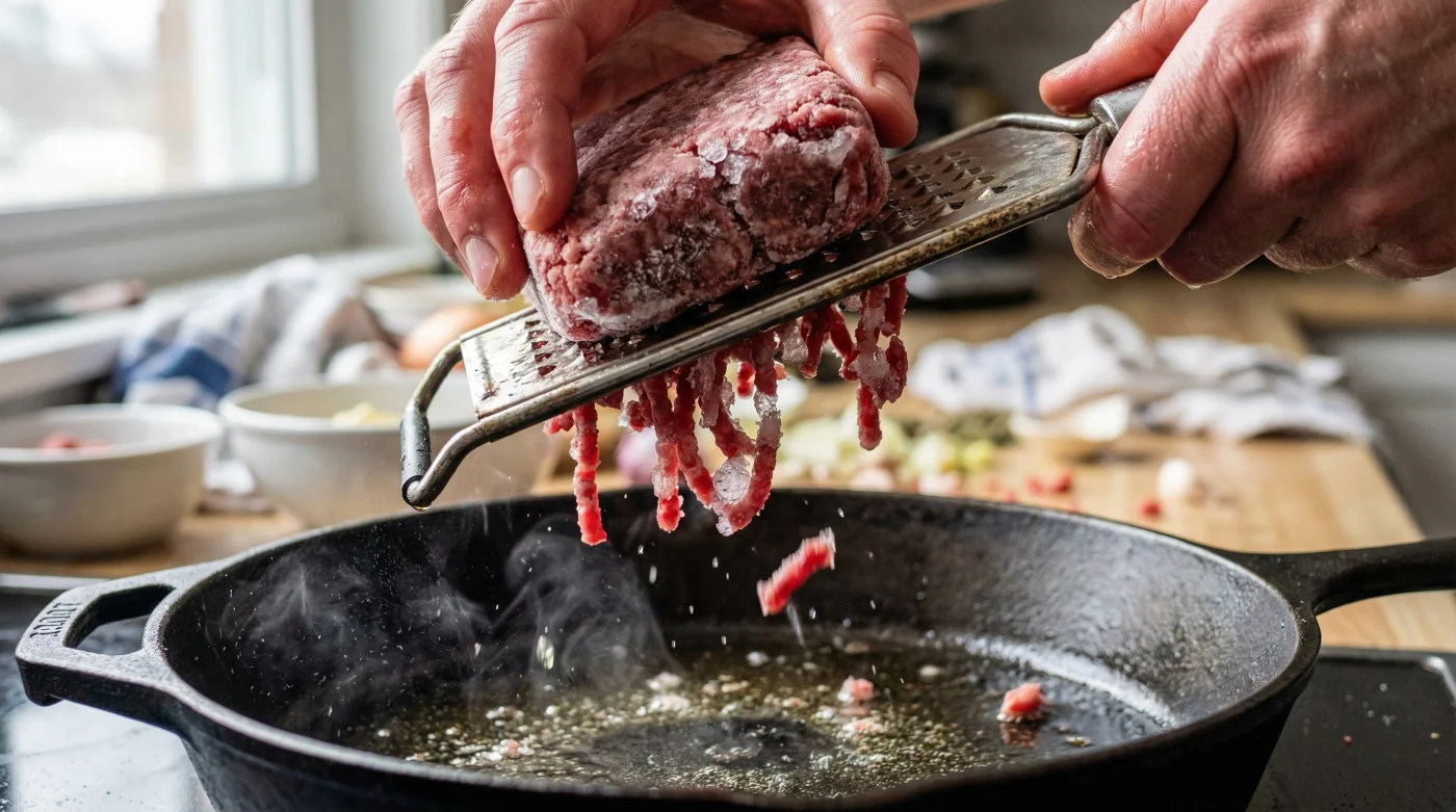 För att förstå varför detta fungerar måste vi titta på vad som faktiskt händer i pannan. När du lägger en stor, upptinad klump köttfärs i en panna sjunker temperaturen dramatiskt. Köttet släpper vätska och börjar koka i sin egen saft. Men när du river fryst köttfärs skapar du tusentals tunna, frysta flingor. Deras yta i förhållande till deras volym är enorm. När dessa lövtunna spån träffar den heta metallen tinar de och steks i exakt samma ögonblick. Maillardreaktionen – den kemiska process som ger stekt mat dess fantastiska smak – sker omedelbart.