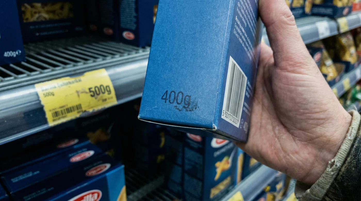 Du står i köket en tisdagskväll. Vattnet kokar upp i kastrullen med tunga, rullande bubblor och du kastar i en rejäl nypa grovsalt. Du sträcker dig efter det mörkblå paketet med spagetti. Det torra, rasslande ljudet när stråna glider ner i vattnet är ljudspåret till den svenska vardagen. Men när du ställer tillbaka kartongen på bänken märker du det. Pappet ger vika lite för lätt. Det känns aningen smalare i handen. Du vänder på paketet och läser det finstilta. Där det i alla tider har stått 500 gram, vilar nu siffran 400 gram.