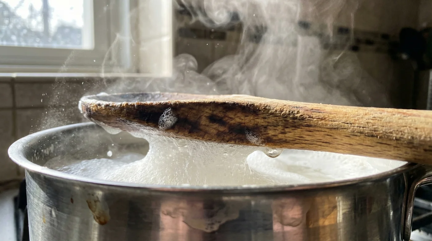 Placera sleven rakt över kastrullens mitt, som en stadig bro. Lämna den bara där. Du kommer att se hur skummet reser sig, sträcker sig upp mot träet, och sedan genast kapitulerar vid kontakt.