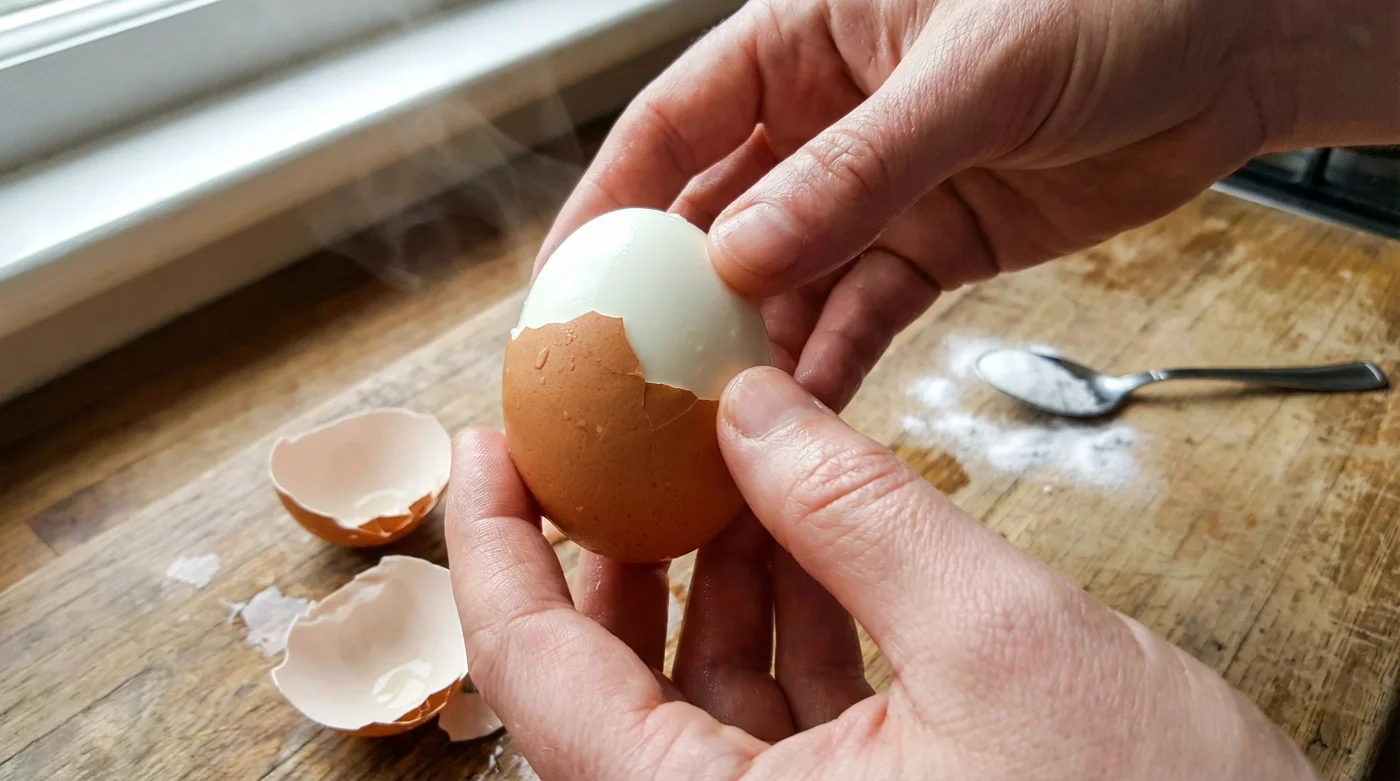 Det alkaliska vattnet tränger in genom det porösa äggskalet under kokningen. Det angriper den där envisa hinnan och får äggvitan att bokstavligen dra sig tillbaka. Hinnan luckras upp och separationen blir omedelbar.