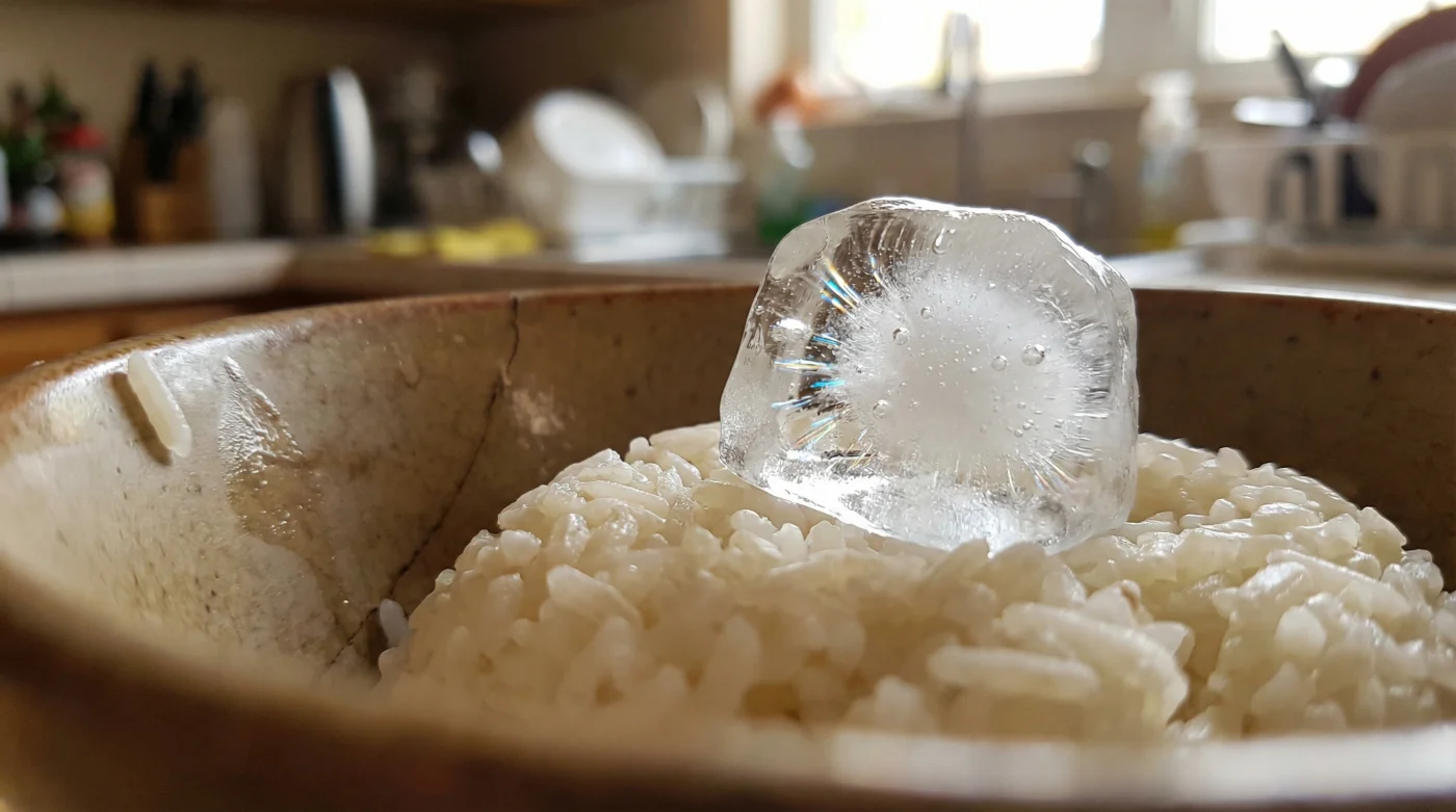 Placera sedan en stor, massiv isbit direkt på toppen, mitt i lådan. Lägg ett lock, eller en vanlig tallrik, över behållaren. Det är här den lilla detaljen gör den stora skillnaden: locket får inte vara helt tättslutande. Lämna en liten glipa på någon millimeter. Denna glipa fungerar som en säkerhetsventil för övertrycket, samtidigt som locket i övrigt stänger inne den värdefulla ångan och tvingar den tillbaka in i riskornen.