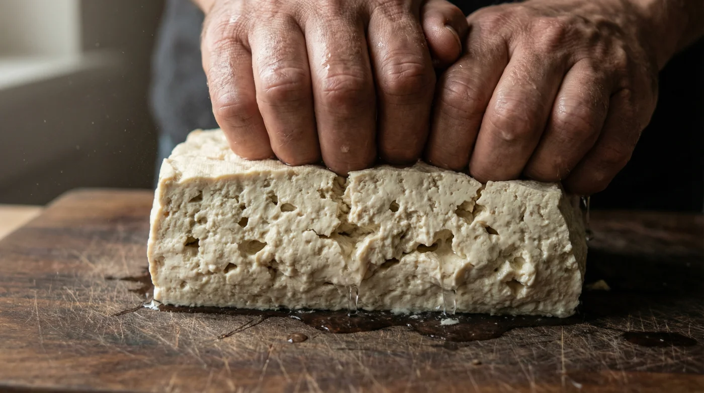 När blocket är mjukt igen kommer du att märka skillnaden direkt i händerna. Klipp upp plasten och häll ut isvattnet. Du behöver inte hämta några tunga böcker. Lägg tofun mellan två rena kökshanddukar, eller bara över vasken, och tryck till försiktigt med båda handflatorna. Vattnet rinner ur blocket utan motstånd, i en jämn ström. Kvar på skärbrädan ligger en tät, tuggig struktur med tusentals tomma, hungriga fickor.