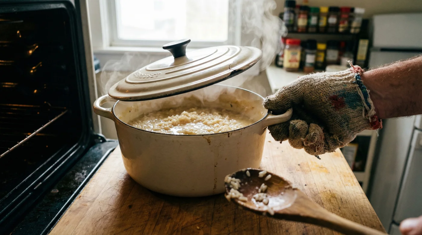 Lösningen är lika briljant som den är enkel. Den kräver bara att du tänker om kring vad ett kokkärl faktiskt är: inte bara en behållare för vätska, utan en liten ugn i ugnen. För att detta ska fungera behöver du en gryta med en tjock botten och ett tätslutande lock. Gjutjärn är din bästa vän här, eftersom det håller och fördelar värmen jämnt.