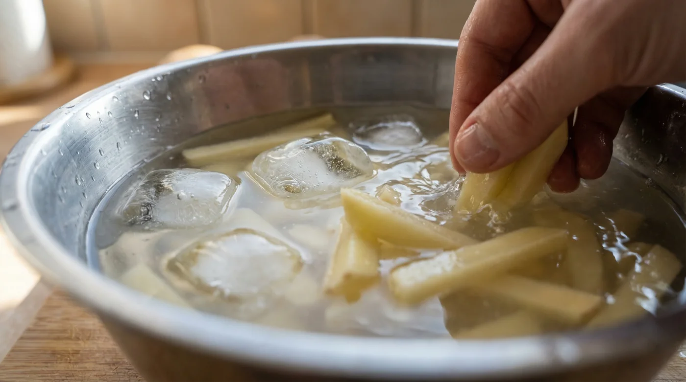 Sänk försiktigt ner stavarna i badet. Redan efter någon minut kommer du att märka hur vattnet antar en grumlig, mjölkig nyans. Det är stärkelsen som ger upp och släpper taget om ytan. Låt dina blivande pommes frites vila i det kalla vattnet i minst fem, men gärna upp till femton minuter. Det är en kort väntan som totalt förändrar slutresultatet.