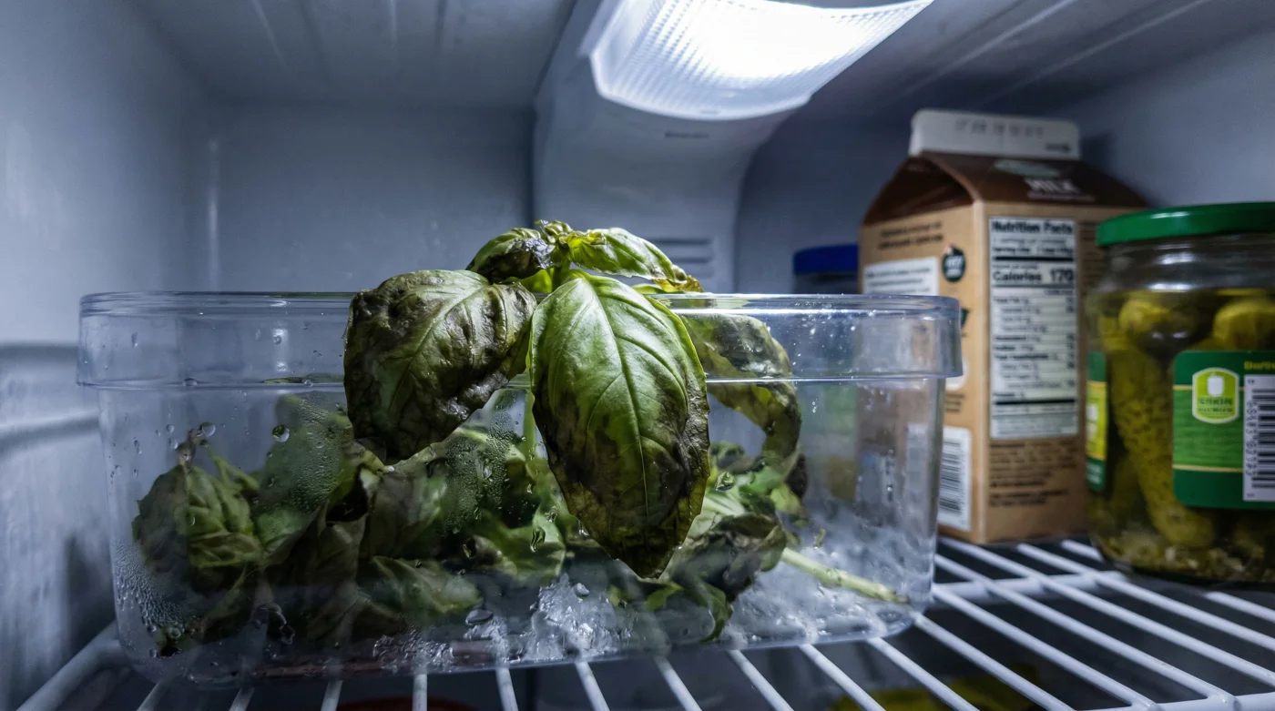 När den färska basilikan möter kylskåpets skoningslösa temperatur sker en radikal och omedelbar fysisk reaktion. Växtens tunna cellväggar, som från fröstadiet är skapade för att hålla vätska under varma, sydeuropeiska förhållanden, saknar elasticitet för kyla. De spricker rakt av. När dessa celler kollapsar frigörs enzymet polyfenoloxidas. Så fort detta enzym möter syret i luften oxiderar bladen och blir bläcksvarta. Du har alltså inte skyddat din ört genom att kyla ner den; rent botaniskt har du krossat dess inre struktur. Den förruttnelse som normalt tar veckor sker nu över en natt.