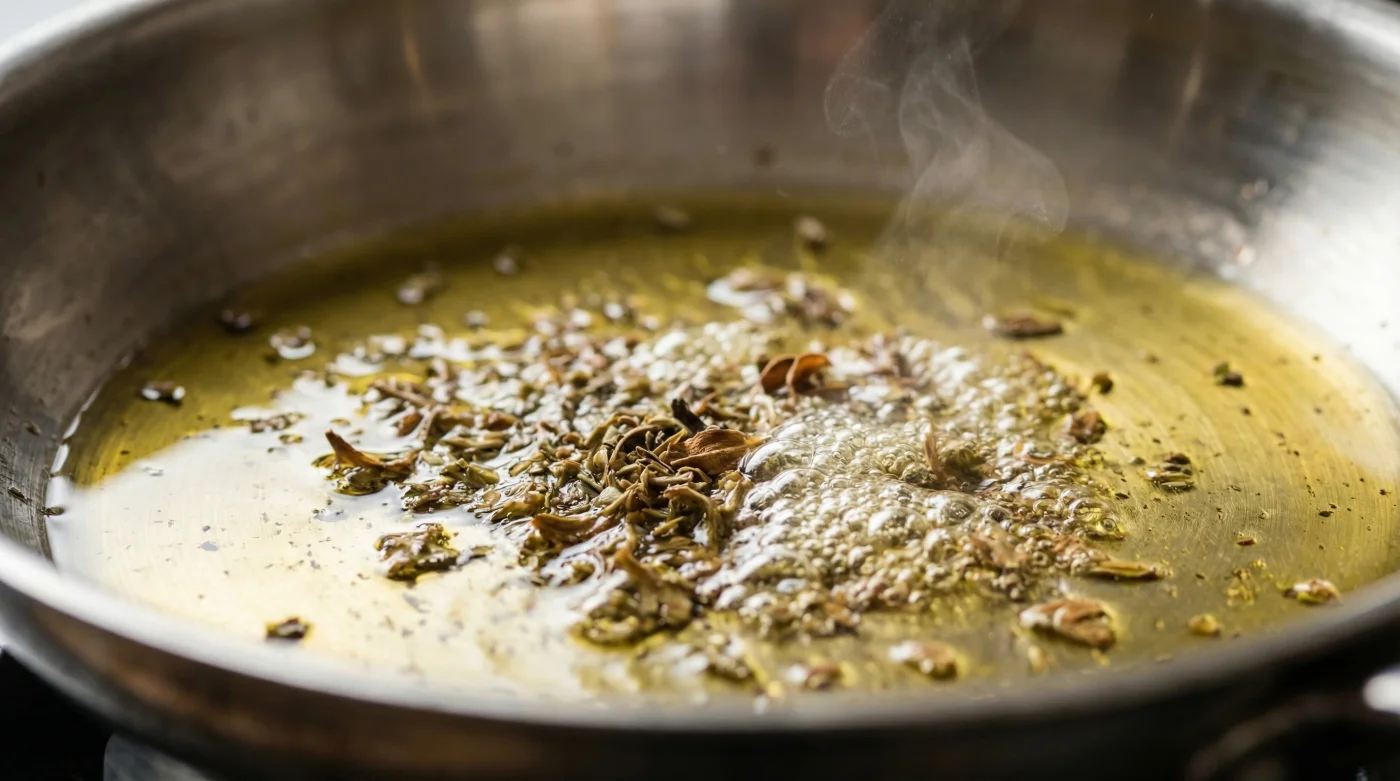 Tänk dig den torkade örten som ett stängt, tätt valv av smak. Under torkningsprocessen har växtens cellväggar krympt ihop och blivit hårda. De eteriska oljorna, själva essensen av vad vi uppfattar som örtsmak, är tryggt inlåsta där inne. Att strö torkad oregano över en puttrande, vattnig tomatsås är som att be en stängd dörr att öppna sig själv i regnet. Vattnet i såsen kan visserligen blöta ner bladet, men det saknar förmågan att tränga igenom cellväggen och bära med sig de fettlösliga oljorna ut i din gryta. Bladet förblir stängt och du missar hela poängen.