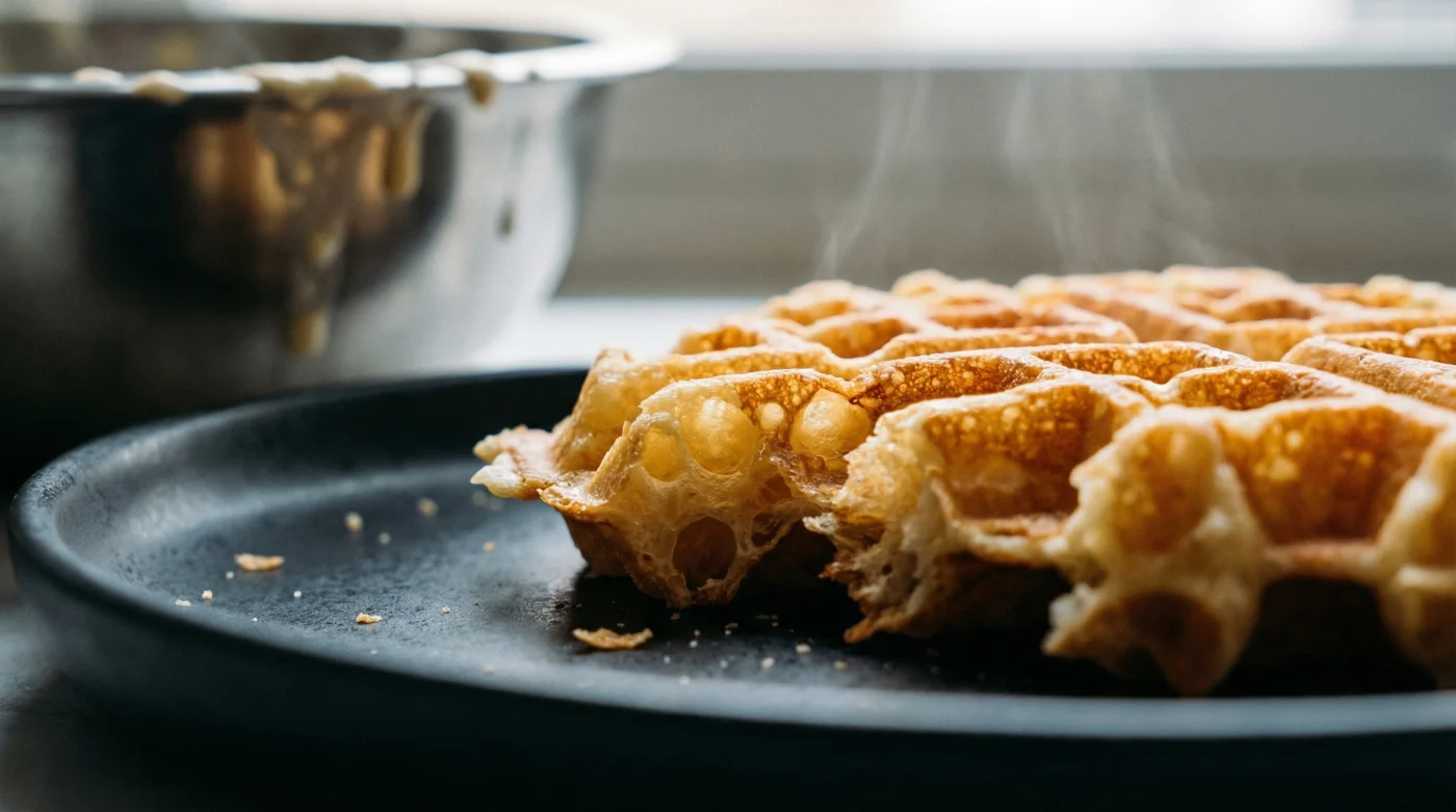 När du slutligen tar ut skålen, motstå frestelsen att röra om kraftigt. Ta bara några försiktiga tag med sleven från botten. Säkerställ att ditt våffeljärn är rykande hett, pensla laggarna med lite extra skirat smör, och häll omedelbart i den kalla smeten. Kontrasten mellan iskall kräm och skållhett järn är den sista avgörande faktorn för en yta som splittras likt tunt glas under tänderna.