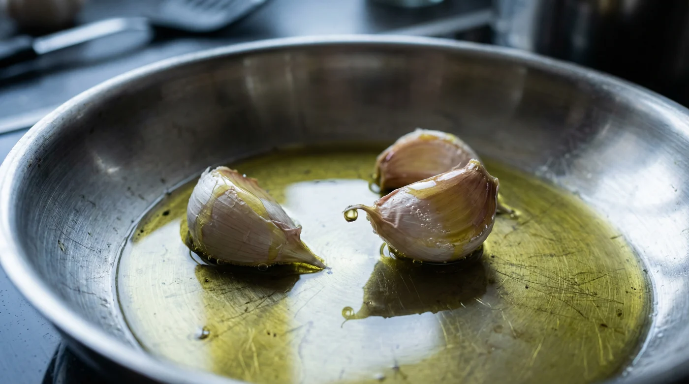 Var uppmärksam på de små pärlorna av luft som börjar dansa runt klyftorna. Genom att tvinga upp temperaturen långsamt maximeras frigörandet av allicin – det ämne som ger vitlöken dess hälsofördelar och distinkta smak – innan de ömtåliga cellerna bränns sönder. När vitlöken börjar få en halmgul, vacker ton har du dragit ut maximalt med arom. Nu är oljan parfymerad och redo för nästa steg i ditt recept.