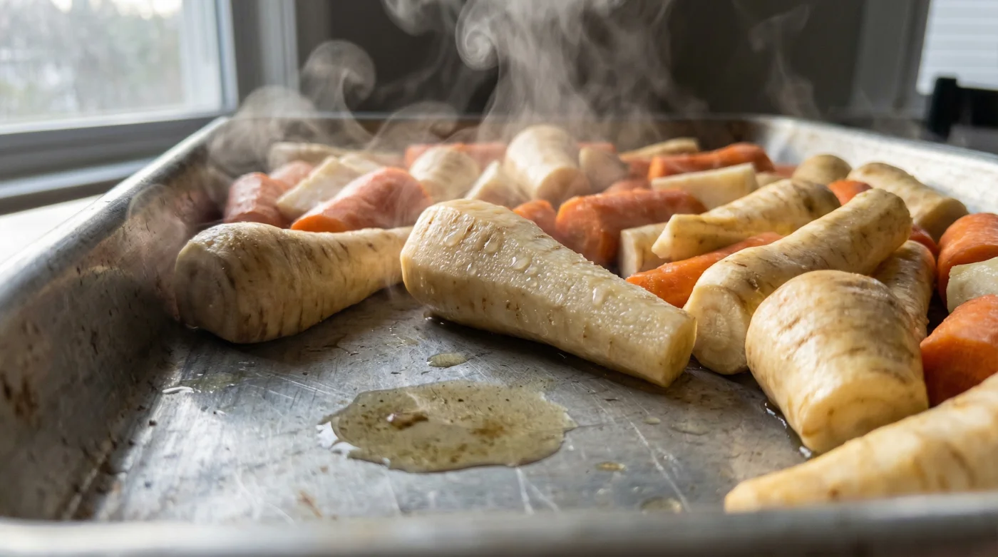 Felet är varken din ugn eller dina råvaror, utan bristen på rymd. När du tränger ihop rotfrukter på en plåt skapar du ett slutet mikroklimat. Grönsaker består till stor del av vatten. När de värms upp börjar de andas ut denna fukt. Om bitarna ligger tätt intill varandra har ångan ingenstans att ta vägen. Den stannar kvar runt maten och tvingar rotfrukterna att kokas i 100 grader Celsius, snarare än att rostas i ugnens 200 grader. Du har av misstag byggt en liten ångbastu åt din middag.
