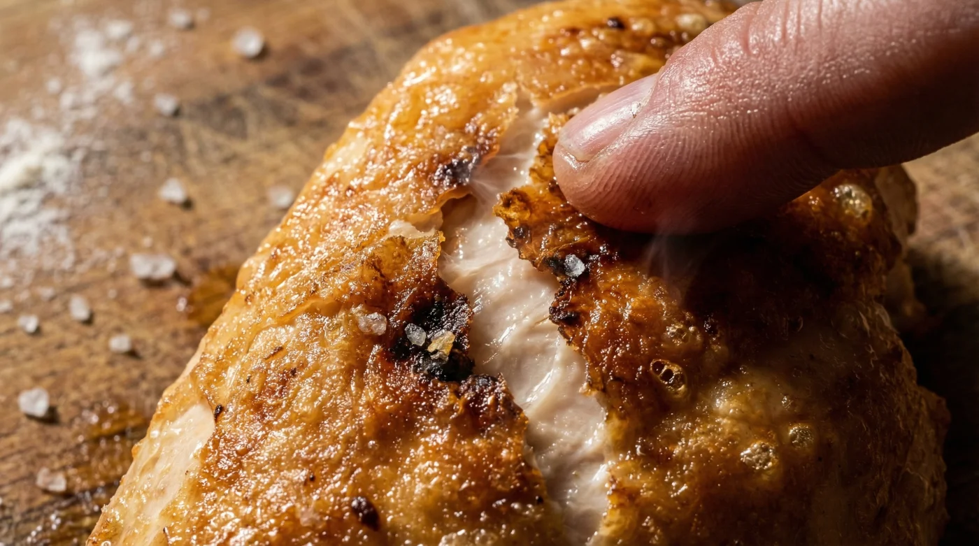 Massera in blandningen omsorgsfullt i köttet med händerna. Du kommer att känna hur ytan nästan omedelbart blir aningen sträv under dina fingrar. Låt sedan köttet vila i kylskåpet, helst i tjugo minuter, men gärna över natten om du planerar i förväg. Det är nu den tysta kemin arbetar och drar ut den envisa vätan. När du sedan lägger in kycklingen i en vanlig ugn på 220 grader, lyssna noga. Du kommer höra hur det fräser, inte av olja, utan av fågelns eget naturliga fett som nu smälter och rostar den torra ytan.