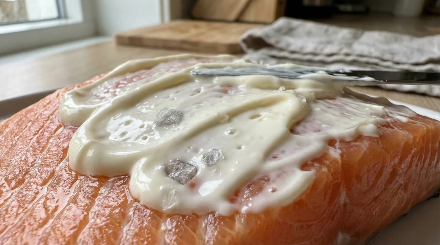 Salta och peppra fisken direkt på det torra köttet. Detta är viktigt eftersom majonnäsen kommer att stänga inne dessa smaker och trycka in dem i råvaran. Ta sedan en generös sked med högkvalitativ, fet majonnäs. Det kan vara en klassisk färdigköpt variant eller en du slagit själv med lite dijonsenap och citron. Stryk ut den med baksidan av skeden. Det är en lugn, medveten rörelse. Lagret behöver inte vara tjockare än två millimeter, men det ska vara jämnt fördelat över hela den exponerade ytan. Inga blottade kanter där värmen kan tränga in.
