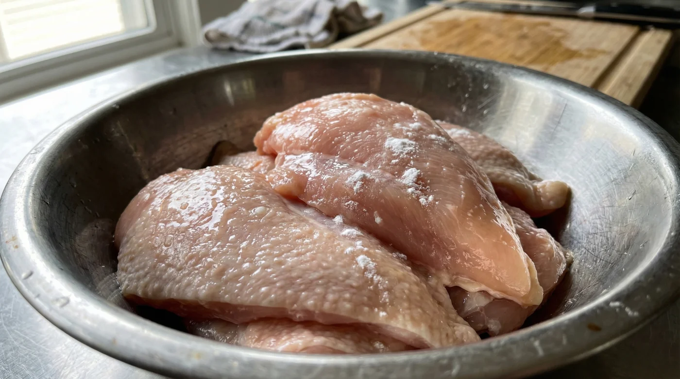 Nu kommer det absolut viktigaste steget, det som skiljer succé från katastrof. Du måste skölja köttet. Bikarbonat har en metallisk, nästan tvålaktig smak som du absolut inte vill ha i din mat. Lägg kycklingen i ett durkslag och spola den under kallt rinnande vatten i en knapp minut. Gnugga lätt med fingrarna för att få bort alla yttre rester.