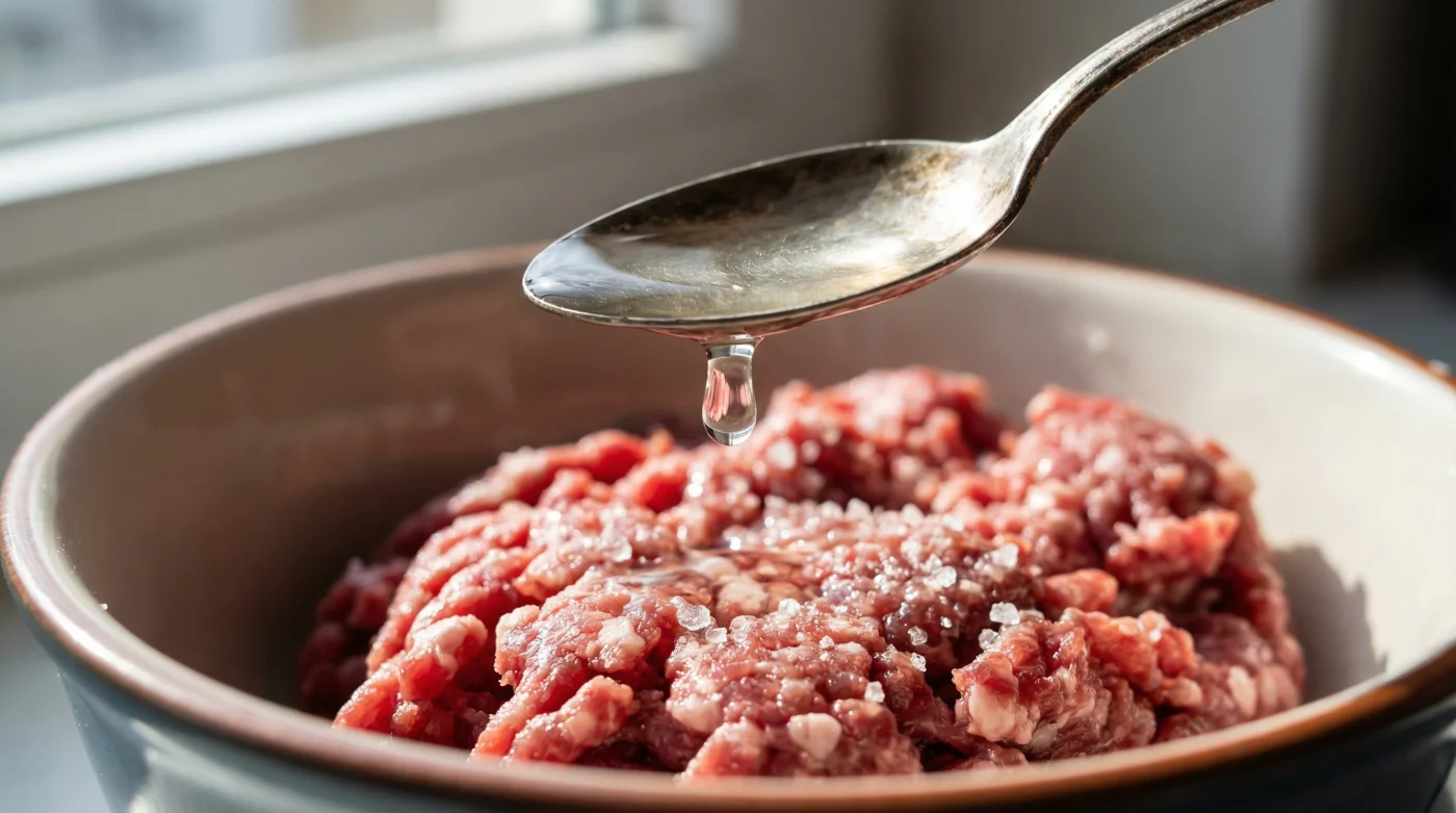 Att applicera denna metod är enkelt, men det kräver precision. Du ska mäta, inte chansa. För ett halvt kilo nötfärs eller blandfärs behöver du exakt en halv tesked 12-procentig ättiksprit. Förbered din vanliga bas: mjölk eller vatten, ströbröd som får svälla, lök, salt och nymalen svartpeppar.